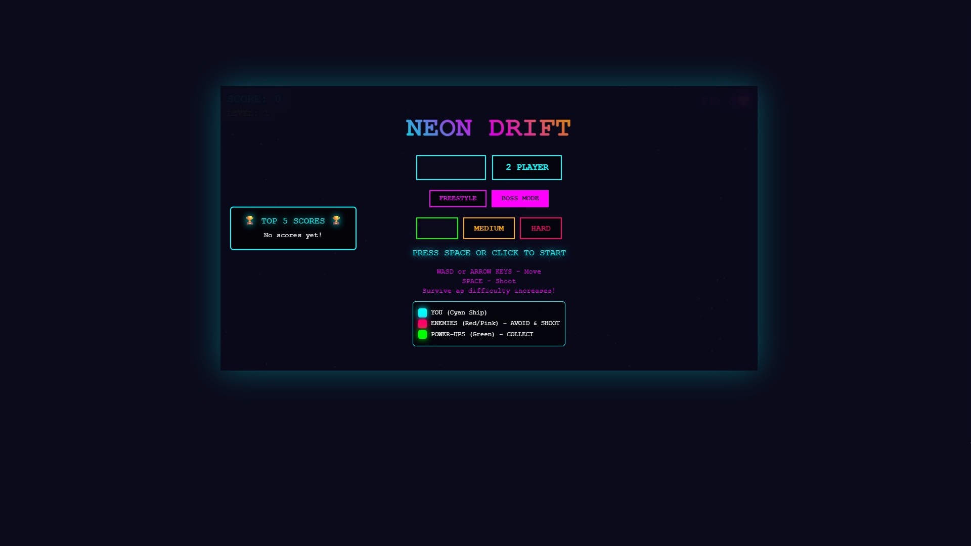 NEON DRIFT is a fast-paced, retro-inspired arcade shooter set in a neon-lit cyber world. Take control of a sleek, glowing ship and navigate through waves of enemies while dodging their attacks and collecting powerful upgrades.